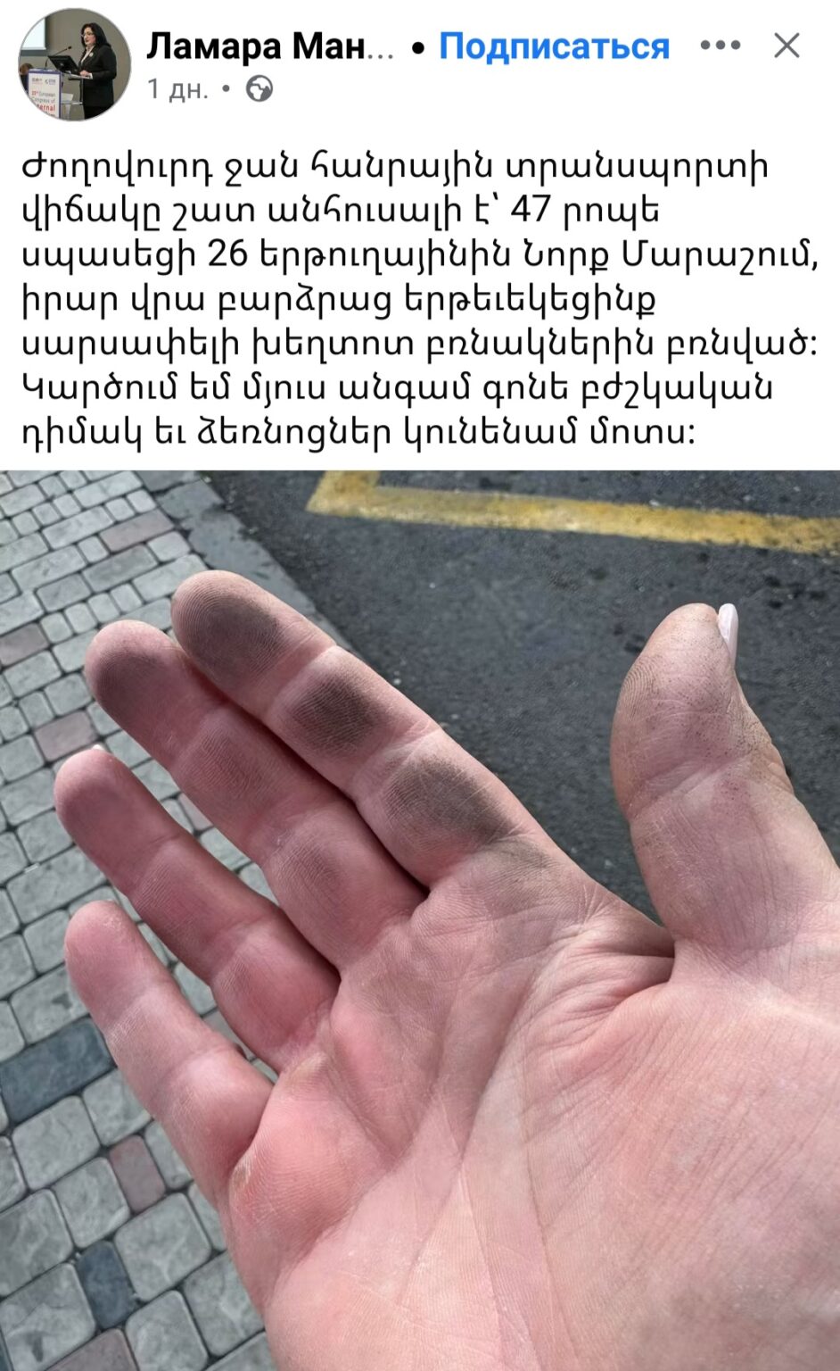 «Ժողովուրդ ջան հանրային տրանսպորտի վիճակը շատ անհուսալի է՝ 47 րոպե սպասեցի 26 երթուղայինին Նորք Մարաշում, իրար վրա բարձրաց երթեւեկեցինք սարսափելի խեղտոտ բռնակներին բռնված։ Կարծում եմ մյուս անգամ գոնե բժշկական դիմակ եւ ձեռնոցներ կունենամ մոտս»։