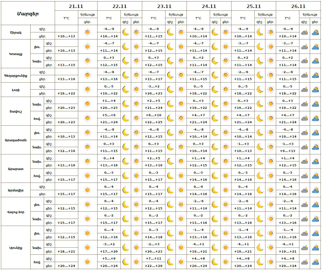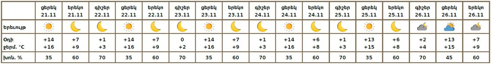 Նոյեմբերի 21-ի ցերեկը, 22-26-ին սպասվում է առանց տեղումների եղանակ, լուսադեմին Արարատյան և Շիրակի դաշտում սպասվում է կարճատև մառախուղ: Քամին հարավարևմտյան՝ 2-5մ/վ: Օդի ջերմաստիճանը նոյեմբերի 21-23-ին ցերեկային ժամերին Լոռիում, Տավուշում և Սյունիքում աստիճանաբար կբարձրանա ևս 2-3 աստիճանով, մնացած շրջաններում Էապես չի փոխվի։