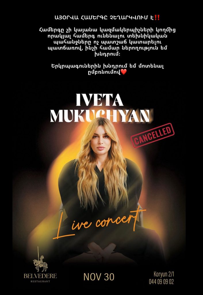 Նշենք, որ նոյեմբերի 30-ին, ժամը՝ 20:00-ին Բելվեդեր ռեստորանում պետք է տեղի ունենար երգչուհու համերգը, սակայն Իվետա Մուկուչյանը հայտնել է, որ այն չեղարկվում է` տեխնիկական պահանջները ոչ պատշաճ կատարելու պատճառով: