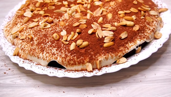 Թթվասերային կրեմի համար խառնել 200 գր թթվասերն ու 2-3 ճ/գ շաքարի փոշին։ Կրեմով պատեկ բիսքվիթը և զարդարել՝ ըստ ցանկության, օրինակ կակաո ցանել և բոված գետնանուշ։ Դնել սառնարանի մեջ և թողնել մի քանի ժամ։