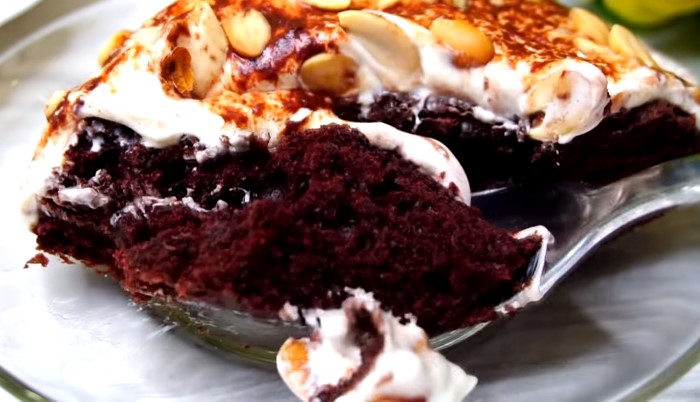 Մյուս ամանի մեջ խառնել 150 գրամ ալյուրը և 2 ճաշի գդալ կակաոն։ Մաղել և ավելացնել 150 գրամ շաքարավազ, կարելի է ավելի շատ կամ քիչ՝ ըստ ճաշակի։ Զանգվածը միավորել մածունի զանգվածի հետ և լավ խառնել՝ մինչ խմոր դառնալը։ Կաղապարը քսել կարագով և լցնել պատրաստի խմորը։ Թխել 25-30 րոպե՝ 200 աստիճան ջերմաստիճանով։